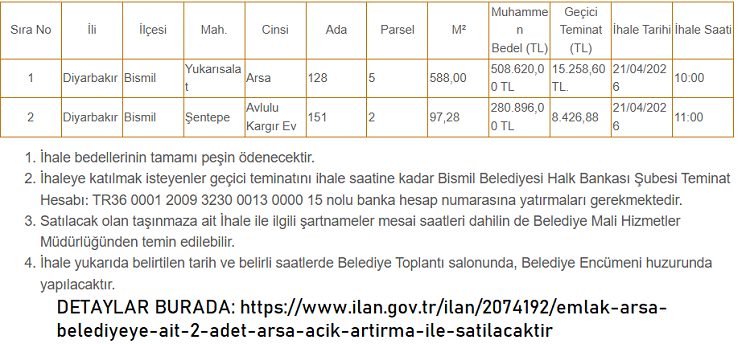 Bismil Belediye Başkanlığı, bir arsanın ve bir evin satışı için resmi süreci başlattığını duyurdu.
