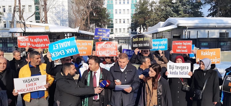 DEM’li Belediyelerde işçi ve sözleşmeli memur çalışanlara yönelik baskı, tehdit, mobbing, haksız işten çıkarmalar, çalışma hakkına yönelen saldırılar ve hukuku hiçe saymalar karşısında sesimizi yükseltmek, itirazımızı büyütmek, hukuki ve idari mekanizmaları işletmek üzere suç duyurusunda bulunmak amacıyla buradayız.