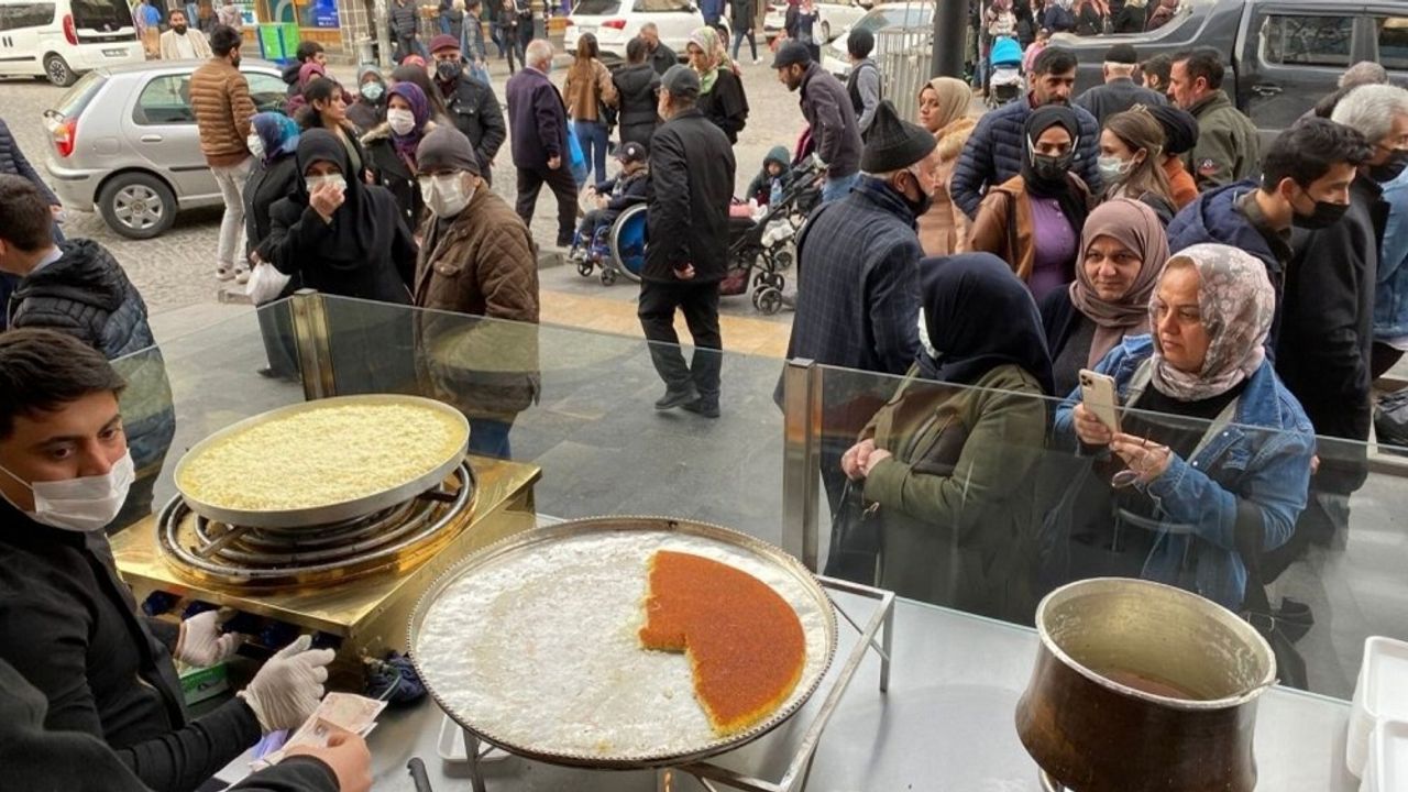 Diyarbakır’ın bilinen özel tatlı şubelerinden olan Sur’daki bir pastanede künefe ustası olan Samet Akçakaya, hafta içi 50 tepsi, hafta sonu ise 70 tepsi civarı tatlı sattıklarını söyledi. Akçakaya, "Porsiyonu şu an 100 lira, içeride oturmak isterseniz 105 lira. İçerisinde tel kadayıf var, en altına da baklava yağı sürüyoruz, üstüne de Hatay'dan kuşbaşı peynir koyuyoruz. Burada da pişirip satıyoruz.