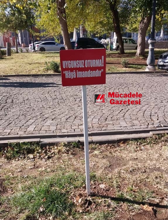 Yeşil alanlarda son dönemde bırakılan levhalar ise dikkat çekti. Kim tarafından bırakılmadı öğrenilmeyen levhalarda “Uygunsuz oturma haya imandandır”, “Uygunsuz oturma, topluma saygı göster” gibi uyarı yazılarının da yer alması dikkat çekti.