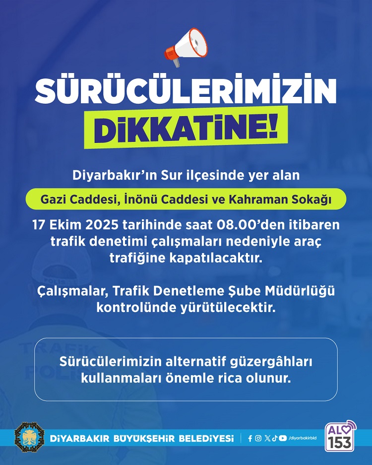 Sur İlçemizde yapılacak denetim çalışmaları nedeniyle Gazi Caddesi, İnönü Caddesi ve Kahraman Sokağı 17 Ekim 2025 tarihinde saat 08.00’den itibaren trafiğe kapatılacaktır.”
