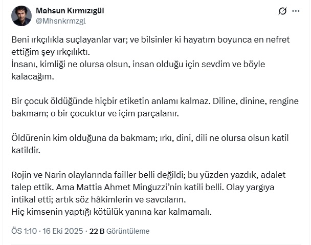 Rojin ve Narin olaylarında failler belli değildi; bu yüzden yazdık, adalet talep ettik. Ama Mattia Ahmet Minguzzi’nin katili belli.