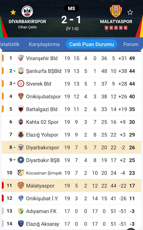 Bölgesel Amatör Ligi’nde mücadele eden Diyarbakırspor, Diyarbakır’da karşılaştığı Malatyaspor’u 2-1 mağlup etti. Diyar’ın gollerini Mahsum Döker ve Burakhan Cevher’den geldi. Puanını 26’ya yükselten Diyarbakırpsor, ligde 8’nci sırada yer aldı.