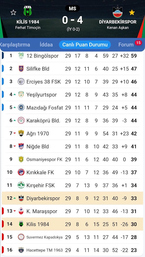 Diyar, bu sonuçla puanını 33’ye yükselterek ligde 12’nci sıradaki yerini korudu.