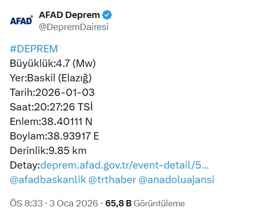 AFAD, “Elazığ ilimizin Baskil ilçesinde, saat 20.27’de 4.7 büyüklüğünde bir deprem meydana geldi. Gelişmeleri takip etmekteyiz” açıklamasında bulundu.