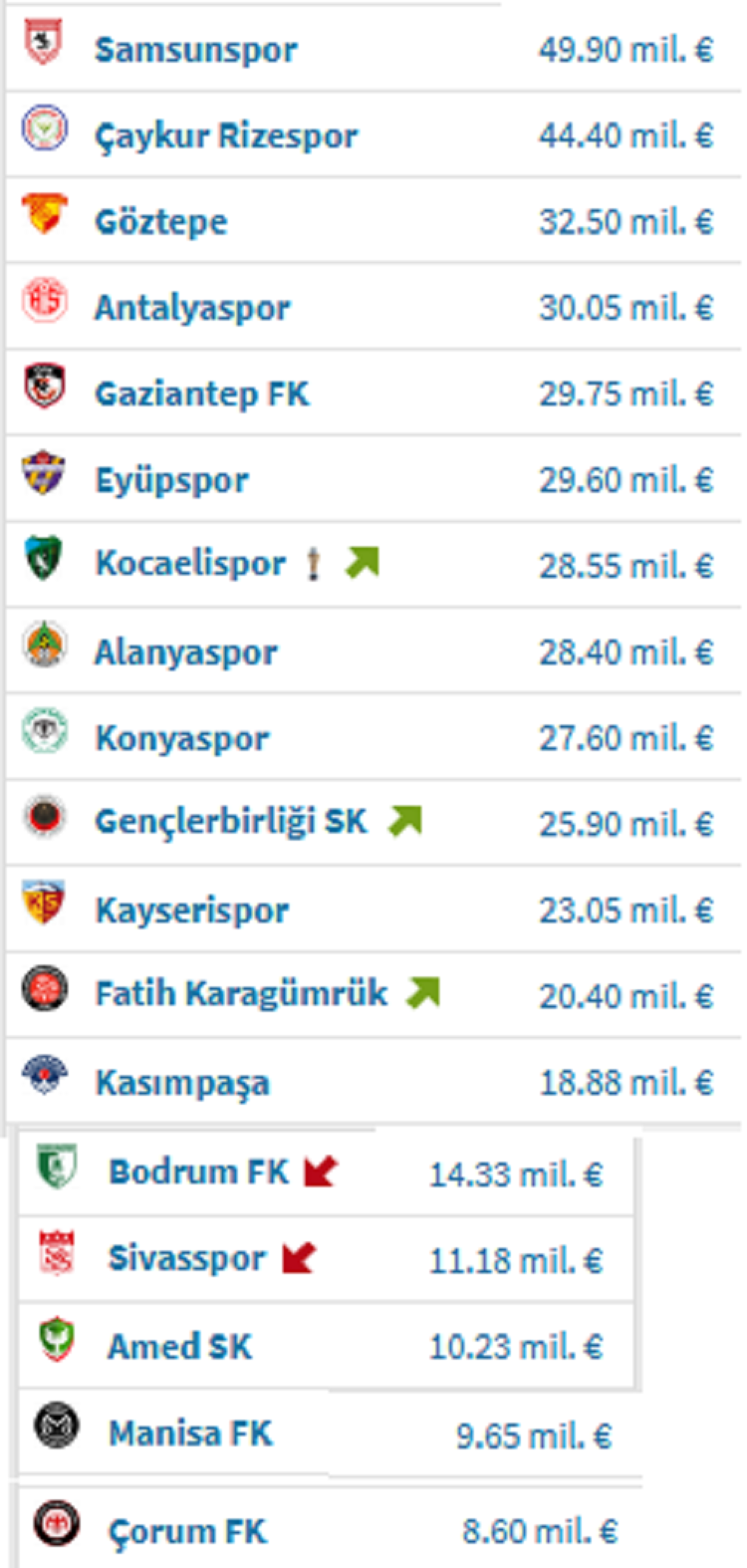 Amedspor ise 10.23 milyon Euro piyasa değeri ile listenin 16.sırasında yerini almayı başardı.