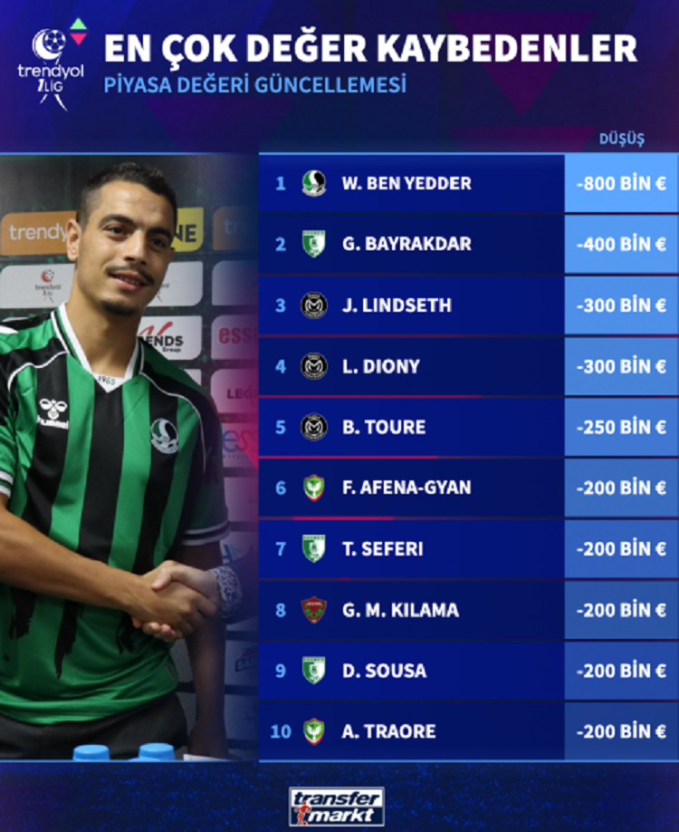 Diyarbakır temsilcisinde forma terleten 4 futbolcu, ligde en fazla piyasa değerinde düşüş yaşayan isimler arasında yerini aldı.