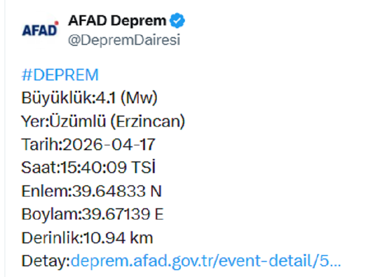 AFAD verilerine göre 4.1 büyüklüğünde Erzincan’da kaydedilen deprem, kısa süreli bir paniğe neden oldu.