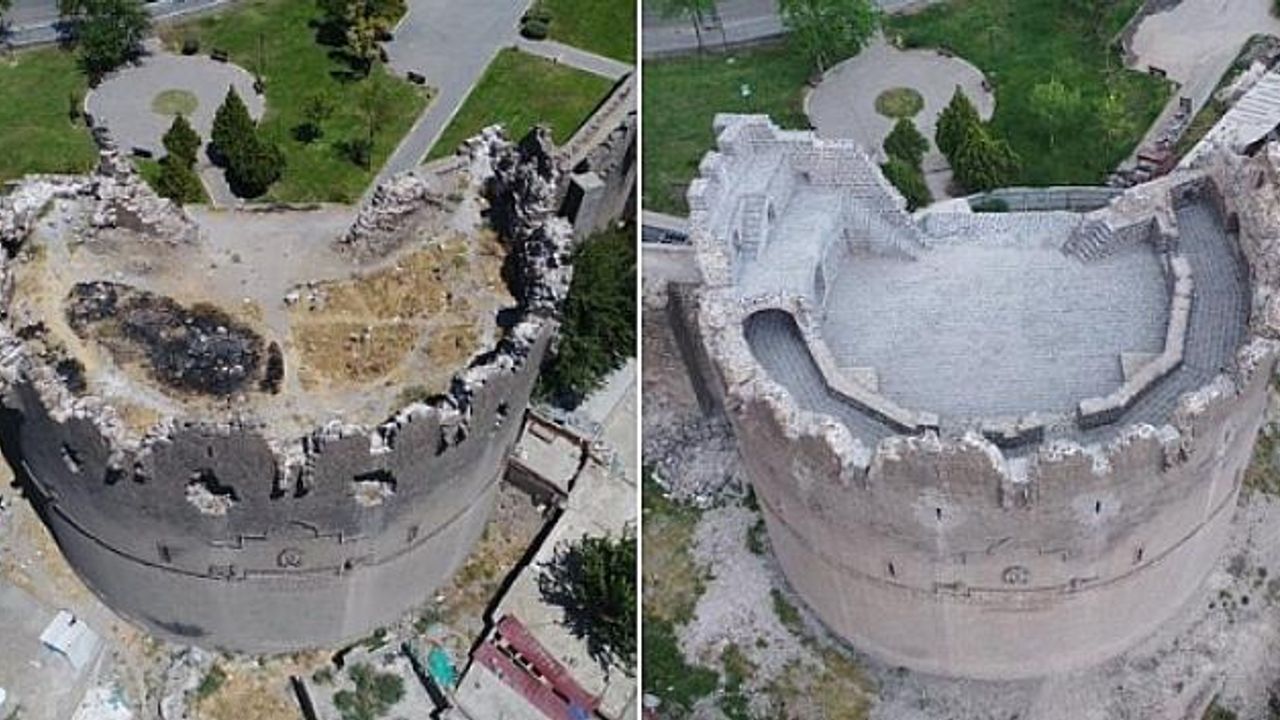 'Surlarda Diriliş' sloganıyla başlatılan restorasyon çalışmaları kapsamında Yedi Kardeş Burcu'nun önceki ve sonraki hali
