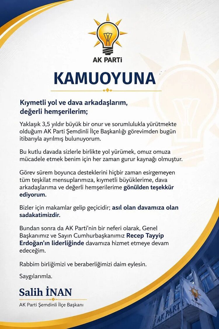 İnan mesajında şu ifadelere yer verdi: "Yaklaşık 3,5 yıldır büyük bir onur ve sorumlulukla yürütmekte olduğum AK Parti Şemdinli İlçe Başkanlığı görevimden bugün itibarıyla ayrılmış bulunuyorum. Bizler için makamlar gelip geçicidir; asıl olan davamıza olan sadakatimizdir."