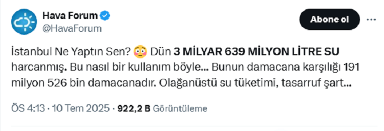 Hava Forum’un yaptığı açıklamaya göre, İstanbul'da dün akıl almaz bir su tüketimi gerçekleşti. Şehir, bir günde tam 3 milyar 639 milyon litre suyu harcayarak rekor kırdı.