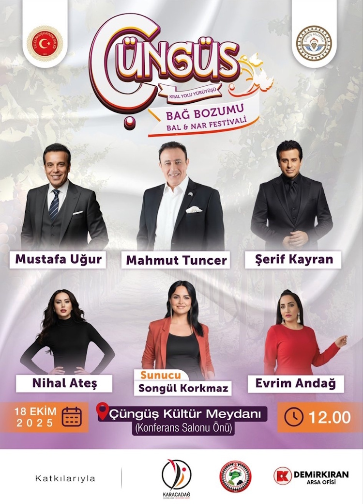Diyarbakır’ın Çüngüş ilçesinde 18 Ekim 2025 tarihinde ‘Bağ Bozumu Bal ve Nar Festivali’ düzenlenecek. Songül Korkmaz’ın sunuculuk yapacağı festivalde Mahmut Tuncer, Mustafa Uğur, Şerif Kayran, Nihal Ateş ve Evrim Andağ sahne alacak.