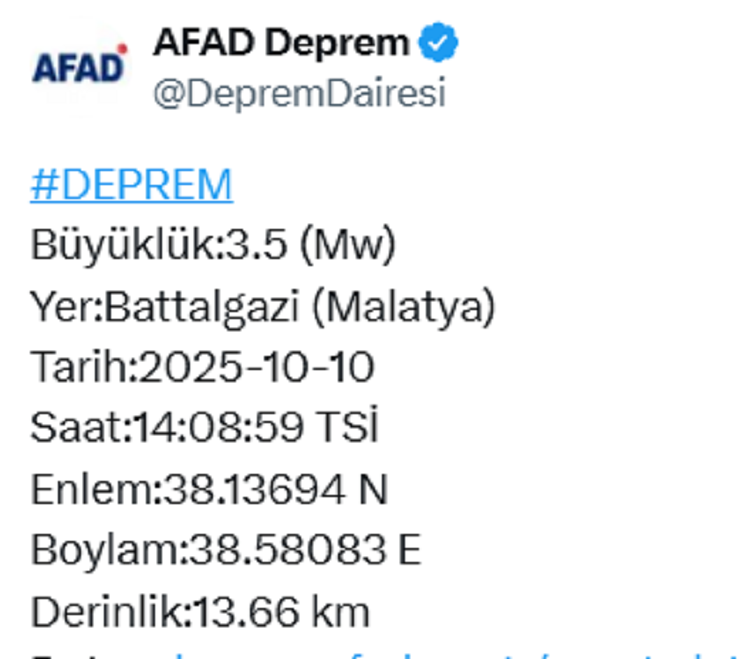 Afet ve Acil Durum Yönetimi Başkanlığı (AFAD), Malatya'da bir deprem meydana geldiğini duyurdu. AFAD verilerine göre sarsıntı, Malatya'nın Battalgazi ilçesinde gerçekleşti.