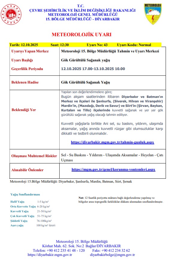 Meteoroloji 15. Diyarbakır Bölge Müdürlüğü-Bölge Tahmin ve Uyarı Merkezi’nden yapılan açıklama şöyle: “Yapılan son değerlendirmelere göre; Bugün akşam saatlerinden itibaren Diyarbakır ve Batman'ın Merkez ve ilçeleri ile Şanlıurfa, (Siverek, Hilvan ve Viranşehir) Mardin'in, (Mazıdağı, Derik ve Savur) ve Siirt'in (Şirvan, Baykan, Kurtalan ve Tillo) ilçelerinde kuvvetli sağanak ve yer yer gök gürültülü sağanak yağış olacağı tahmin ediliyor. Kuvvetli yağışlarla birlikte Ani sel, su baskını, yıldırım, ulaşımda aksamalar, yağış anında kuvvetli rüzgar gibi olumsuzluklar karşı dikkatli ve tedbirli olunmalıdır.”