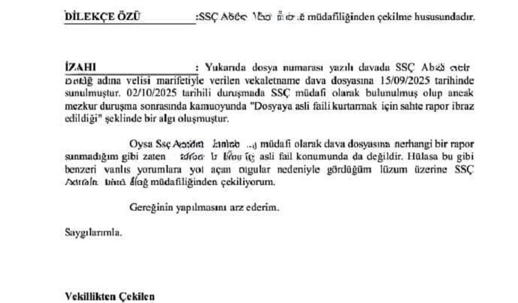Avukat çekilme dilekçesinde, "Yanlış yorumlara yol açan olgular nedeniyle gördüğüm lüzum üzerine müdafiliğinden çekiliyorum" ifadelerini kullandı.