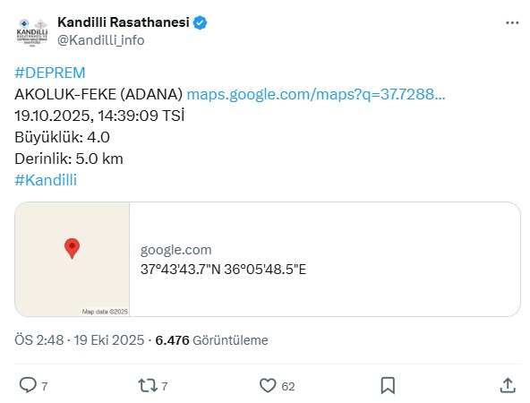 Kandilli Rasathanesi ise, depremin yerini Adana’nın Akoluk-Feke bölgesi olarak açıkladı. Depremin büyüklüğü ise 4 olarak bildirildi.