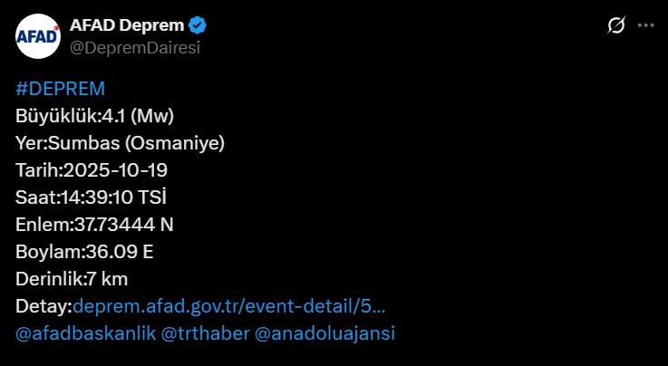 Afet ve Acil Durum Yönetimi Başkanlığı (AFAD) verilerine göre, Osmaniye'nin Sumbas ilçesinde 4.1 büyüklüğünde deprem meydana geldi.