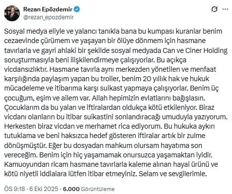 "Sosyal medya eliyle ve yalancı tanıkla bana bu kumpası kuranlar benim cezaevinde çürümem ve yaşayan bir ölüye dönmem için hasmane tavırlarla ve gayri ahlaki bir şekilde sosyal medyada Can ve Ciner Holding soruşturmasıyla beni ilişkilendirmeye çalışıyorlar. Bu açıkça vicdansızlıktır. Hasmane tavırla aynı merkezden yönetilen ve menfaat karşılığında paylaşım yapan bu troller, benim 20 yıllık hak ve hukuk mücadeleme ve itibarıma karşı suikast yapmaya çalışıyorlar. Benim üç çocuğum, eşim ve ailem var. Allah hepimizin evlatlarını bağışlasın. Çocuklarım da bu yalan ve iftiralardan oldukça kötü etkileniyor. Biraz vicdanı olanların bu itibar suikastini sonlandıracağı umuduyla yazıyorum. Herkesten biraz vicdan ve merhamet rica ediyorum. Bu hukuka aykırı tutuklama ve beni haksızca hedef gösteren iftiralar artık bir zulme dönüşmüştür. Eğer bu dosyadan mahkum olursam hayatıma son vereceğim. Benim için hiç yaşamamak onursuzca yaşamaktan iyidir. Kamuoyundan ricam hasmane tavırlarla kaleme alınan hayal ürünü ve kötü niyetli iddialara lütfen itibar etmeyiniz. Selam ve sevgilerimle."
