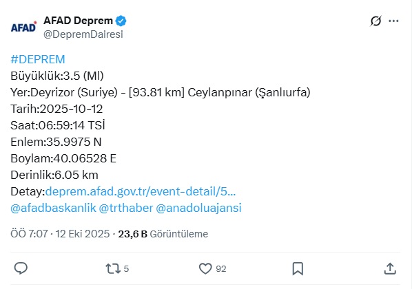 Afet ve Acil Durum Yönetimi Başkanlığı (AFAD), Şanlıurfa'nın Ceylanpınar ilçesine yakın bir noktada, Suriye sınırları içerisinde orta kuvvette bir deprem meydana geldiğini bildirdi. Deprem, Türkiye tarafında özellikle Ceylanpınar ve çevresinde hissedildi.