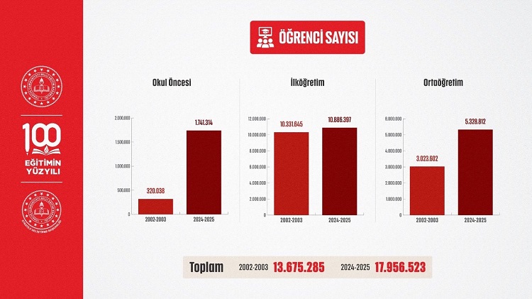 MEB tarafından açıklanan verilere göre, toplam öğrenci sayısı 13.6 milyondan 17.9 milyona yükselirken, özellikle okul öncesi eğitimdeki devasa büyüme dikkat çekti.