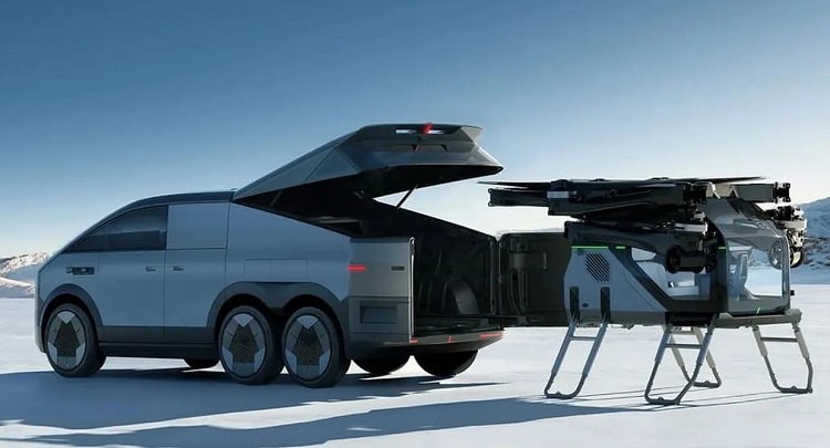 Araç, birbirini tamamlayan iki ana modülden oluşuyor. Kara Modülü (Mothership), 5,5 metre uzunluğundaki üç akslı ve altı tekerlekli devasa bir araç. 800V menzil genişletici (EREV) platformu üzerine inşa edildi. Hibrit yapısı sayesinde karada 1000 km’den fazla menzil sunarken, arkasında taşıdığı hava modülünü park halindeyken veya seyir halindeyken şarj edebiliyor.