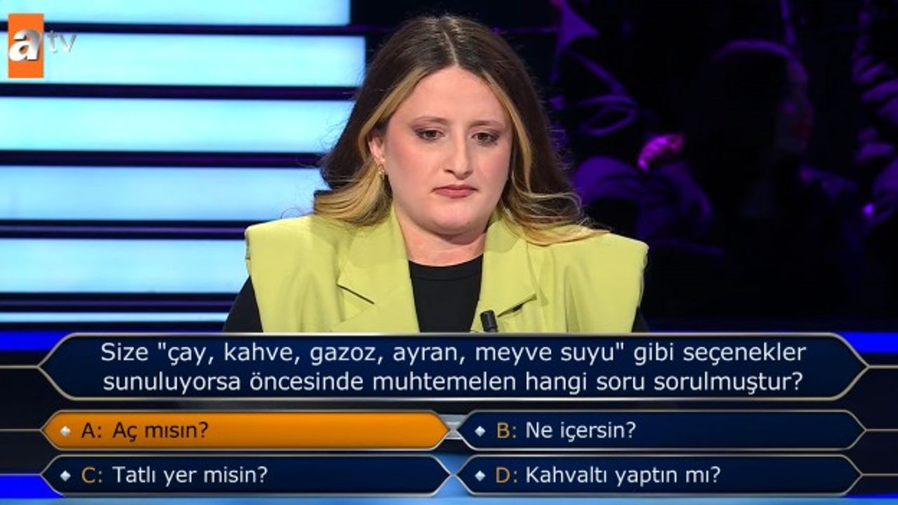 Heyecanına yenilen genç kadın "Size 'çay, kahve, gazoz, ayran, meyve suyu' gibi seçenekler sunuluyorsa öncesinde muhtemelen hangi soru sorulmuştur?" sorusunda "Aç mısın?" şıkkını seçerek yarışmaya veda etti.