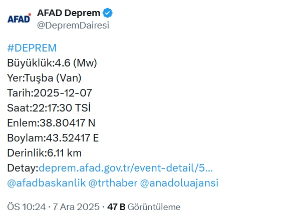 AFAD’tan yapılan açıklamada, “Van ilimizin Tuşba ilçesinde saat 22.17’de meydana gelen 4.6 büyüklüğündeki #deprem sonrası, an itibarıyla, olumsuz bir durum bulunmamaktadır. Saha tarama çalışmaları devam etmektedir. Etkilenen vatandaşlarımıza geçmiş olsun dileklerimizi sunarız” denildi.