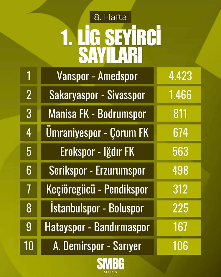 TFF 1. Lig 8. Hafta seyirci sayıları belli oldu. Vanspor – Amedspor maçı 4 bin 423 seyirci sayısıyla ligde en çok izlenen maç oldu. İşte Ligdeki diğer maç ve seyirci sayıları: