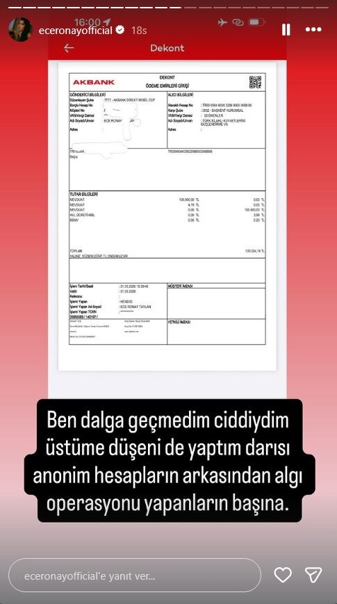 Ece Ronay’ın avukatı Oğuzhan Yeni, müvekkilinin yaptığı paylaşımda herhangi bir art niyet bulunmadığını ve paylaşımın tamamen sosyal medyanın verdiği mizahi iletişim çerçevesinde yapıldığını belirtti. Yeni, açıklamasında ayrıca şunları kaydetti: “Müvekkilim, askerimize duyduğu saygıyı ve sevgiyi defalarca dile getirmiştir. Ancak medya, bu açıklamaları görmezden gelmiş ve bir algı operasyonuna neden olmuştur. Müvekkilimize yönelik yapılacak her türlü haberin takipçisi olacağız ve edilen her hakaret ve iftiranın davacısı olacağız.”