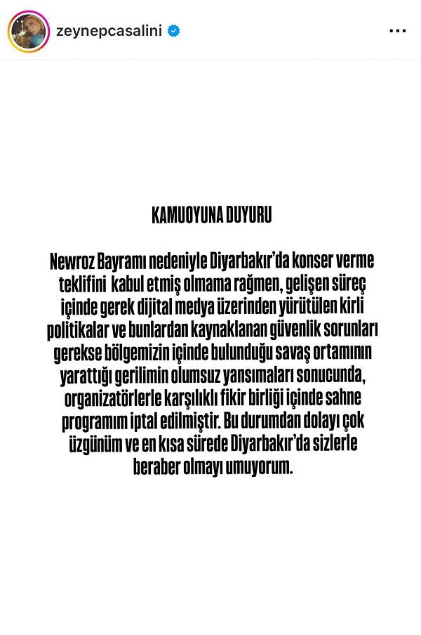 Zeynep Casalini’nin açıklaması şöyle: “Newroz Bayramı nedeniyle Diyarbakır’da konser verme teklifini kabul etmiş olmama rağmen, gelişen süreç içinde; gerek dijital medya üzerinden yürütülen kirli politikalar ve bunlardan kaynaklanan güvenlik sorunları, gerekse bölgemizin içinde bulunduğu savaş ortamının yarattığı gerilimin olumsuz yansımaları sonucunda, organizatörlerle karşılıklı fikir birliği içinde sahne programım iptal edilmiştir. Bu durumdan dolayı çok üzgünüm ve en kısa sürede Diyarbakır’da sizlerle beraber olmayı umuyorum.”